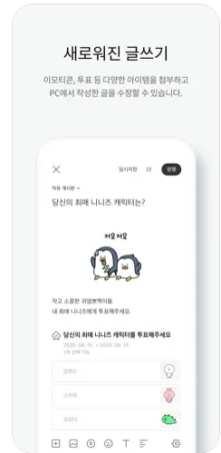 - 글쓰기와 댓글 기능 강화: 글 작성 중 사진, 영상, 투표 등을 첨부할 수 있으며, 댓글을 보며 바로 댓글을 작성할 수 있는 편의성도 갖췄습니다.