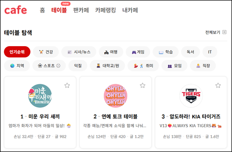- 테이블 기능: 카페 가입 없이도 참여 가능한 '공개테이블', 사용자 인증을 거치는 '인증테이블' 등 다양한 형식의 소통 공간을 제공합니다.