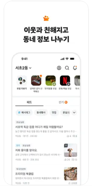 - 동네생활 게시판: 이웃들과의 소소한 대화나 질문, 정보 교류가 가능한 커뮤니티 공간입니다.