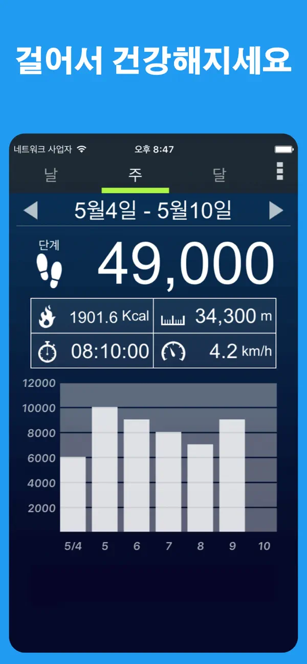 이 만보계 어플은 스마트폰을 주머니나 가방에 넣고 다니기만 해도 자동으로 걸음 수를 측정합니다. 별도의 설정 없이 일상생활을 하며 걷는 모든 움직임이 기록되며, 실시간으로 걸음 수와 이동 거리, 보행 시간까지 확인할 수 있어 운동량을 손쉽게 파악할 수 있습니다.