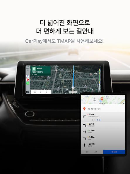 티맵 내비게이션 설치 이후에는 주행 데이터를 기반으로 한 장소 추천 서비스와 주행 점수 기능을 사용할 수 있습니다. 렌터카 예약과 공항버스 예약 및 결제 기능도 티맵 내비게이션 설치 후 이용 가능합니다. 사용자 인터페이스는 모바일 환경에 맞춰 구성되어 있으며, 지속적인 업데이트가 진행되고 있습니다.
