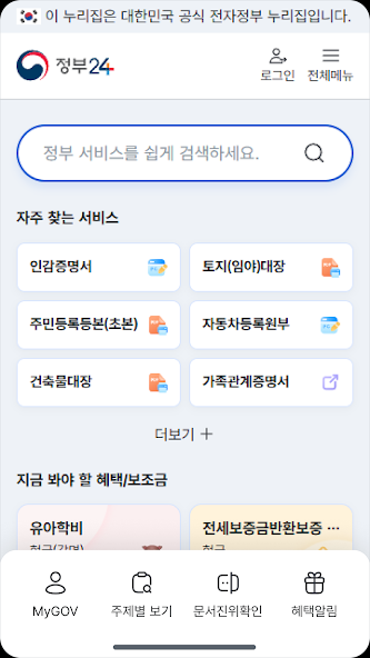 정부24는 정부의 서비스, 민원, 보조금24, 정책·정보를 통합 제공하는 대한민국 정부 대표포털 입니다.